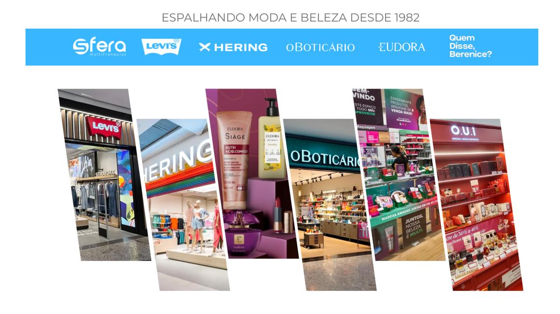Representamos as marcas Hering (O básico do Brasil), Levi’s (A inventora de calça jeans), O Boticário (Onde tem Amor tem Beleza) Quem Disse, Berenice? (Pra ficar bonita, tem que ser do seu jeito!) e EUDORA (Seu Brilho é Único).